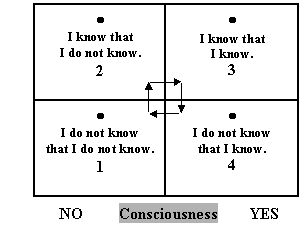 The first stage is characterized by ignorance. So it is not knowledge; it has no content. Actually, it is not a consciousness either, because man can never have this thought in the mind as long as he is in that stage of the mind. In the second stage too there is no knowledge because there is no content. Now, how do I know it? I know it by comparing my ignorance with others' knowledge or when I have a consciousness that has a reference to the absence of a content in the logical space. So this kind of 'knowledge' is consciousness, not knowledge as defined in this paper. It, however, can better be considered a kind of awareness, which is to be visualized as a wave in the infinite expanse of consciousness. In the third stage there is knowledge because here I am conscious of a certain content in my thought. So, there are both consciousness and knowledge. In the fourth stage there is knowledge but there is no consciousness of it. Now the knowledge has been earned and naturalized. So I do not need to be aware of it to be able to use or apply it. In this stage, knowledge gives its utmost benefit at the peak point of the learning curve; it gives both efficiency and effectiveness because in this stage knowledge becomes mechanical. It is about this stage of knowledge that the philosopher Alfred North Whitehead (1861-1947) prudently said that: “Civilization advances by extending the number of operations which we can perform without thinking about them (Quoted in Myers 1983:41)." If, meanwhile, we endeavor to relate the above model to theories of management; we will make a prudent link. It is quite apparent that management should utilize this mechanical nature of knowledge to the utmost. But this stage has its drawback too. It is in this stage that a person gets stuck in assumptions and trapped in old ideas, and it becomes hard for him to go beyond his mindset. This is the most notorious obstacle to the strategic management process in the present age of severe competition. In this case what hinders a person from earning further knowledge is his previous knowledge. We can identify each stage of knowledge by a two-dimensional point in the following manner.