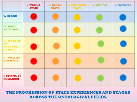 Here we see the ontological fields of Integral Vedanta on the vertical axis and on the horizontal axis the names of the five state-stages of consciousness Vivekananda accessed during his training. I visualize the basic process as states moving horizontally across and intersecting the entire array static fields in the sequence 1 – 2 -3 – 4 – 5, i.e. from the waking state to the non-dual state.